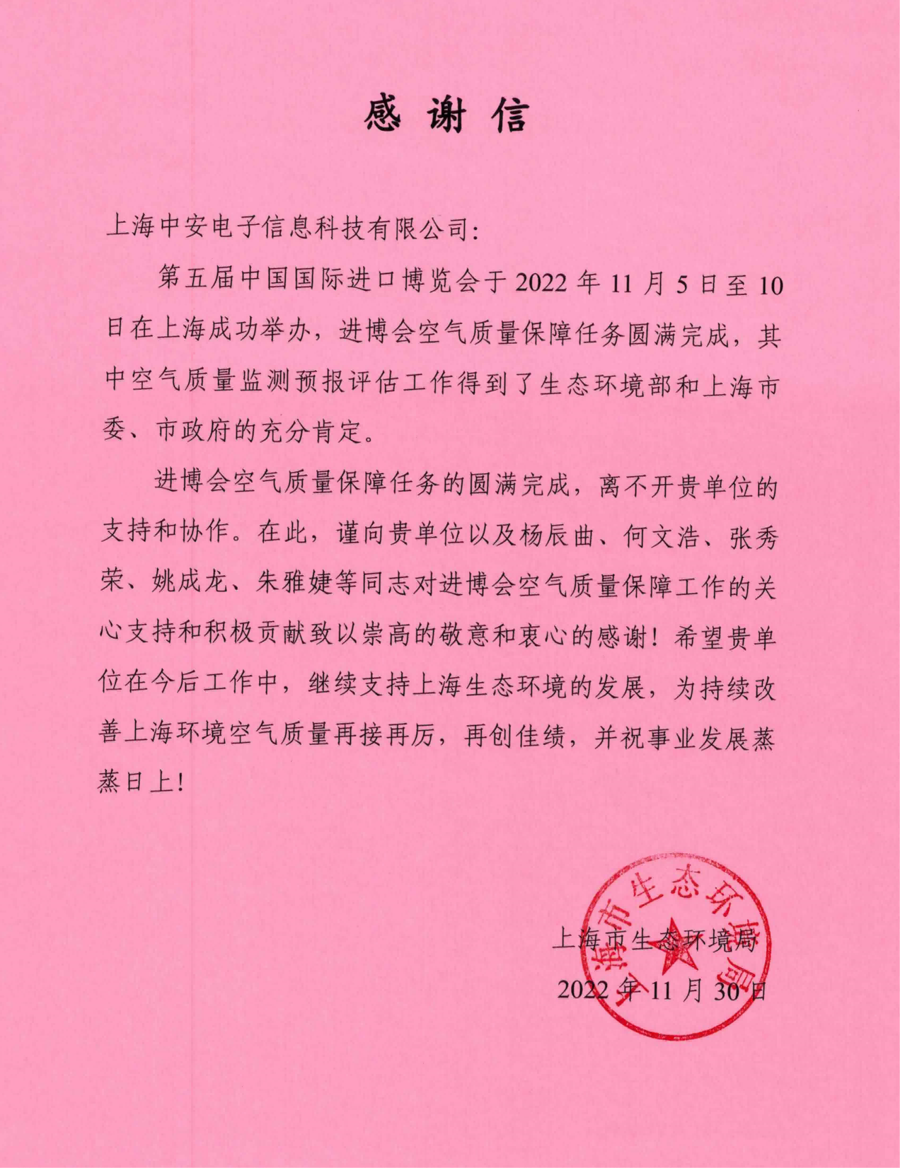 上海市生態環境局致上海中安的一封感謝信!(2025-01-10)